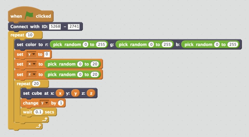 - Special blocks for S2AR are available under “More Blocks” category. Drag “Connect with ID:” block to Scripts Area, and input ID appeared in S2AR app, then click the block.