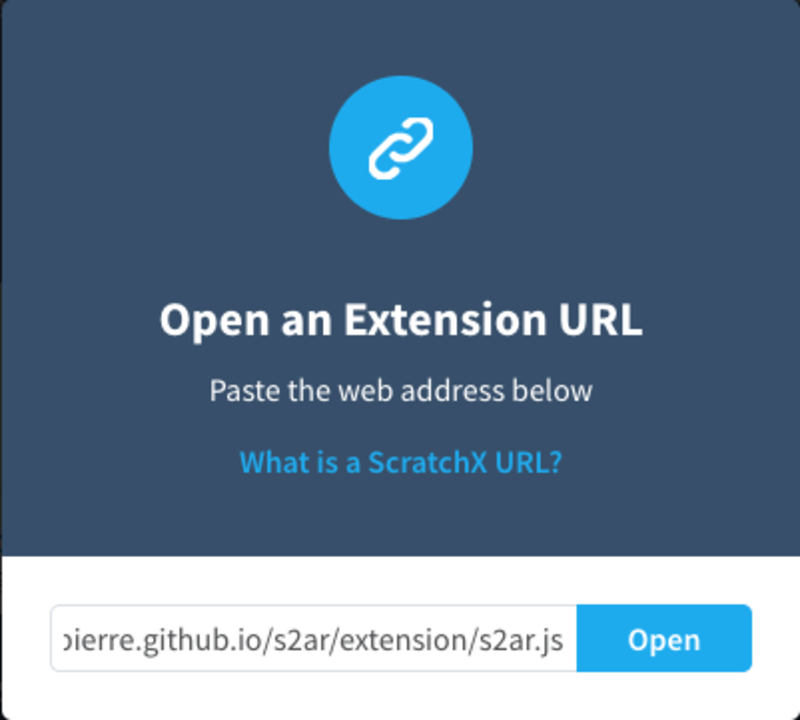 - On ScratchX website, click “Open Extension URL”, paste “https://champierre.github.io/s2ar/extension/s2ar.js” in URL field and click “Open”.